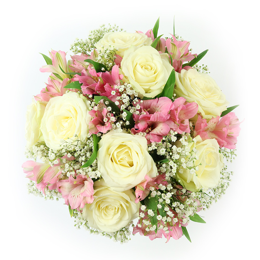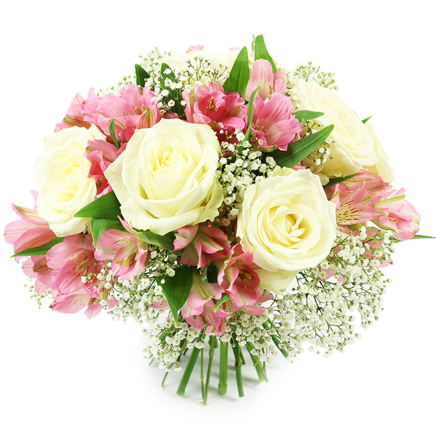 Our hand-tied bouquet showcases the grace and uniqueness of white roses, pink alstroemeria, delicate gypsophila, and lush greenery. This elegant arrangement is perfect for any heartfelt occasion.