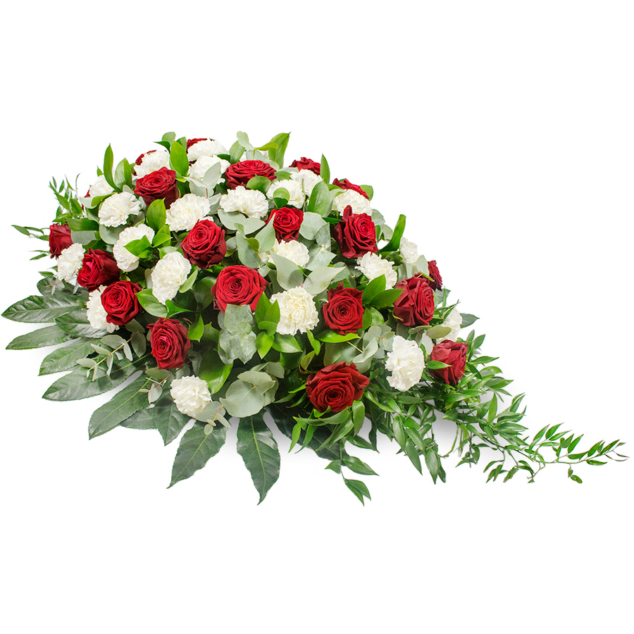 Commemorate the wonderful life of a close someone that will always be remembered. This lovely display of red roses, white carnations and greenery is perfect to offer your condolences to the grieving family and comfort them during a difficult time.
