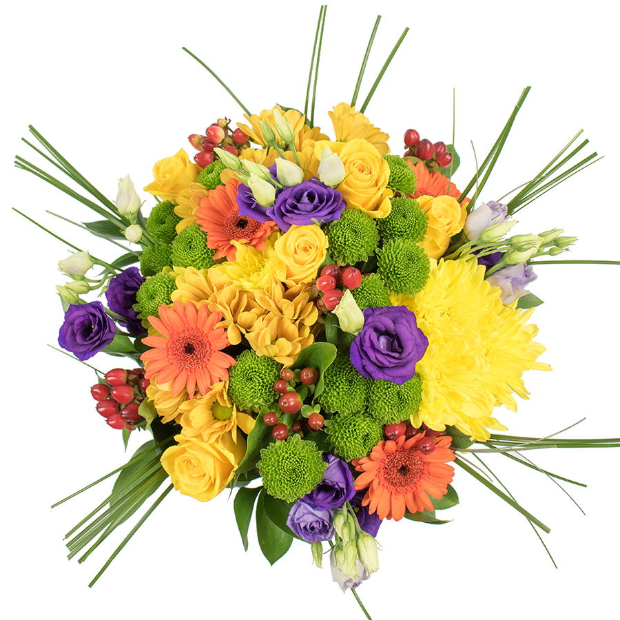 Embrace the warmth of summer with our Vibrant Summer Bouquet. This exquisite arrangement combines yellow roses, lively green and yellow chrysanthemums, vivid orange gerberas, graceful white and purple lisianthus, and rich red hypericum. The harmonious blend of colors creates a truly unique and beautiful display that will delight any recipient.