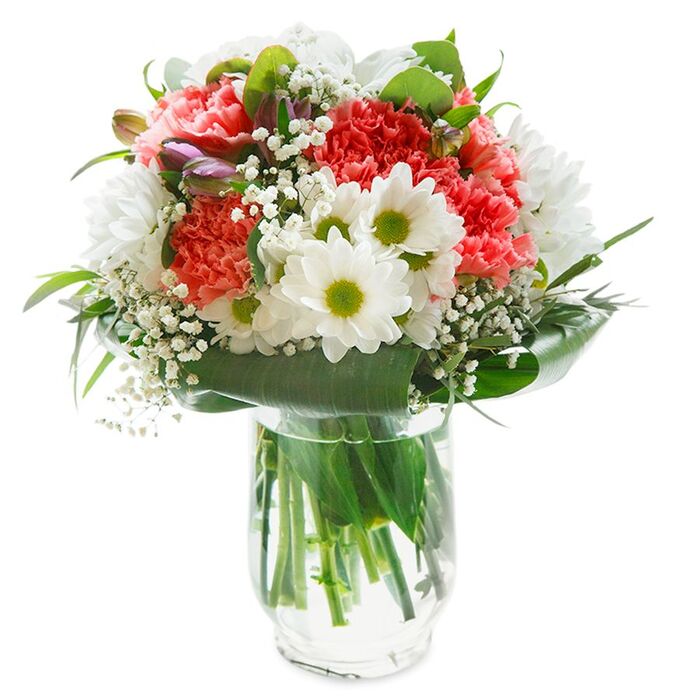 Celebrate special moments with our exquisite seasonal flower arrangement. Featuring a stunning mix of snow-white chrysanthemums, gypsophila, and light pink carnations, all artfully arranged with aspidistra leaves.